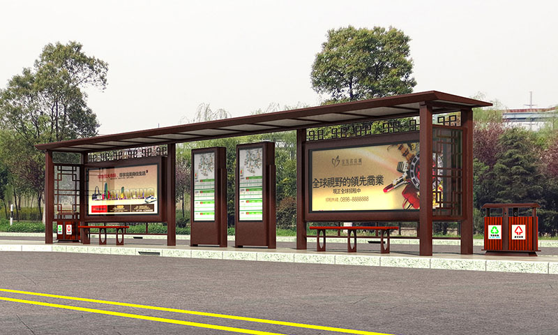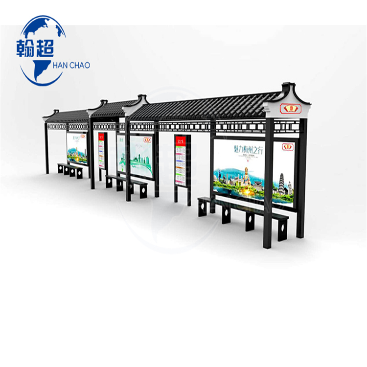 仿古款候车亭一般认为与古典民族文明息息相关,依据当地的历史或民俗文明规划定制。见得最多的是铜色或许深咖色作为亭体基调、顶棚采用仿古瓦的款式,比照特征候车亭的概念,