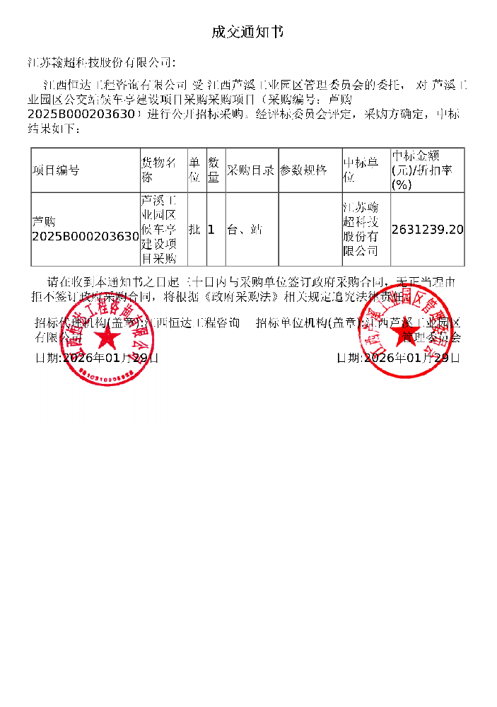 中标项目:达拉特路雨污分流管网改造工程(一期)施工三标段(智能公交站)采购项目中标单位:江苏翰超科技股份有限公司中标金额:2730000元